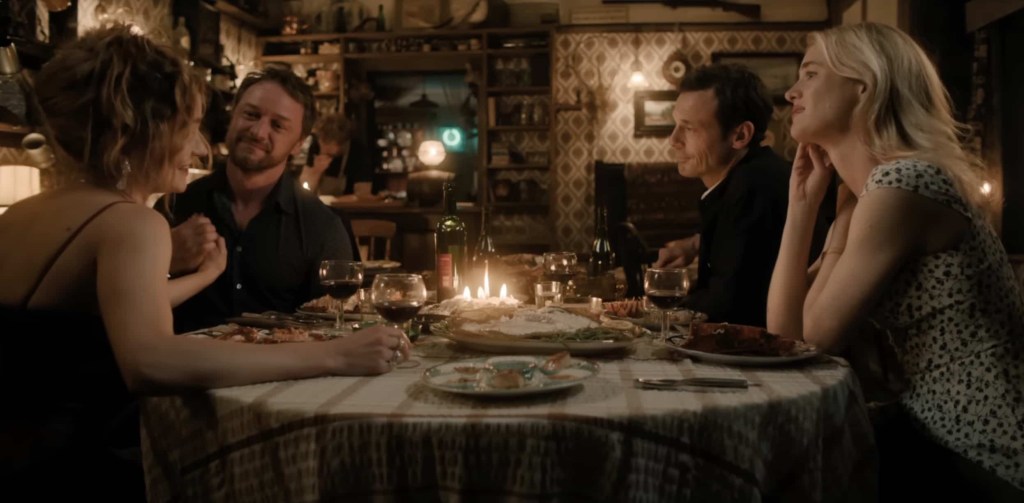 Louise (Mackenzie Davis) and Ben (Scoot McNairy) are an American couple vacationing in Italy with their 11-year old daughter Agnes (Alix West Lefler). They meet charming British couple, Paddy (James McAvoy) and Ciara (Aisling Francoisi), who invite them to spend a weekend at their countryside estate. They do, and they quickly become uncomfortable due to various reasons, but are hesitant to leave and offend them. This lovely holiday weekend gradually becomes a psychological nightmare.