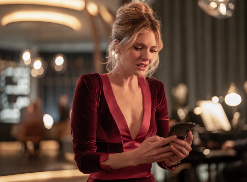 I also really was enjoying the technical aspects on display here. Drop was filmed in Ireland, which you’d never know this as production designer Susie Cullen has sleekly and efficiently put together the look of this restaurant in a Chicago high-rise. There’s a hallway with lighting that puts the viewer on edge from the minute Violet arrives there, and as a viewer you would absolutely want to meet someone for drinks at this restaurant, even with all that goes on here. Cinematographer Mark Spicer, who has worked with Landon previously, shot this and there is a lot of really inventive, cool camerawork here that does a lot to set the vibe. The mostly single-location setting gives way to lots of claustrophobia and intensity. Gwen Jeffares-Hourie’s costume design is also pretty fantastic, namely the red cocktail dress Fahy wears for the majority.